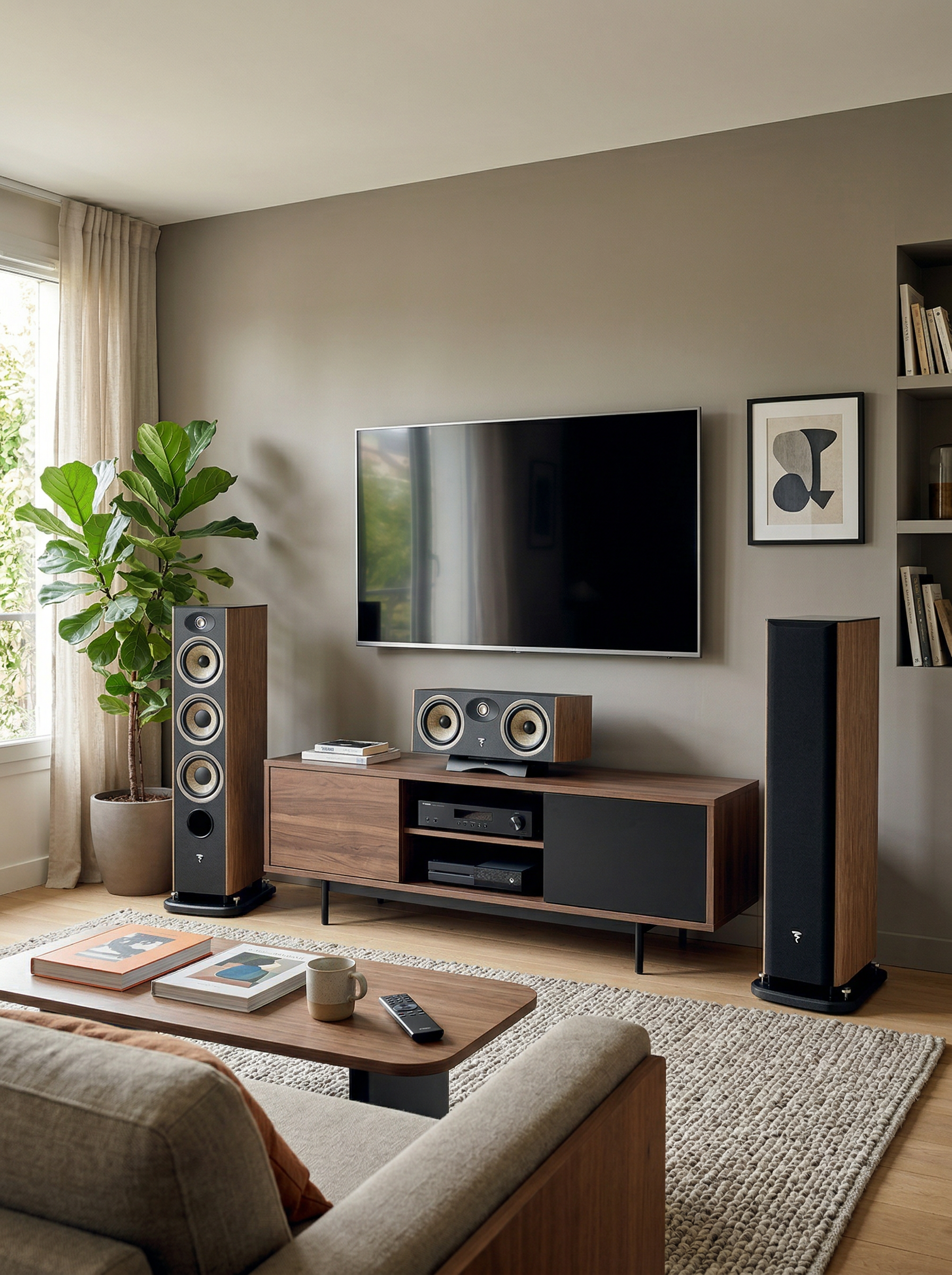 El Focal Aria Evo X Center debe ubicarse justo al centro del sistema frontal, idealmente debajo del televisor o pantalla de proyección y alineado horizontalmente con los oídos del oyente cuando está sentado, procurando que el frente del altavoz quede al ras del mueble para evitar reflexiones indeseadas y dejando al menos 20–30 cm libres detrás para que los puertos bass-reflex respiren correctamente; este altavoz se conecta a un receptor AV de buena calidad (de potencia acorde a su impedancia y sensibilidad) mediante cable de parlante de cobre libre de oxígeno (OFC) calibre 12 o 14 AWG, utilizando conectores tipo banana o conexión directa firmemente ajustada a los bornes, y debe configurarse en el menú del receiver como “canal central” para que gestione correctamente los diálogos. En un sistema completo puede combinarse con torres frontales como las Aria Evo X N2, altavoces surround laterales y un subwoofer activo para reforzar los graves, creando un sistema 5.1 o 7.1 equilibrado; además, el espacio ideal sería una sala de estar o cine en casa con alfombra, cortinas o mobiliario que ayude a controlar la reverberación, evitando colocarlo dentro de muebles cerrados que compriman el sonido, logrando así diálogos claros, centrados y perfectamente integrados con el resto del sistema en un entorno doméstico real.