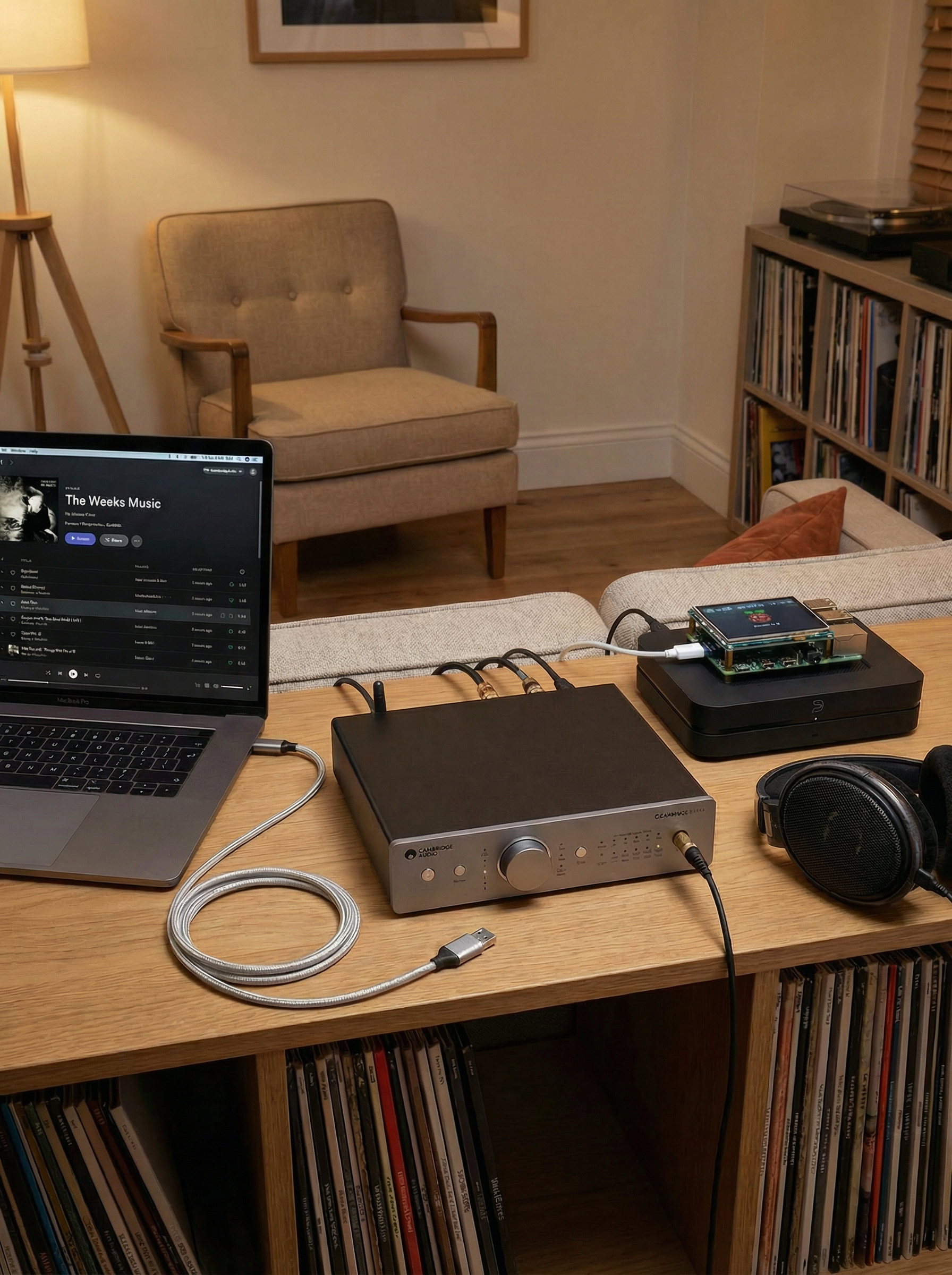 El Cambridge Audio DacMagic 200M es un DAC (convertidor digital-analógico) de alta fidelidad cuya función principal es transformar la señal digital de tus fuentes (TV, streamer, computador, CD, celular, etc.) en una señal analógica de mucha mayor calidad para que tu amplificador o audífonos la reproduzcan con máximo detalle. En términos prácticos, es extremadamente útil porque actúa como el “cerebro de sonido” del sistema: mejora notablemente la claridad, la escena y la precisión frente a los DAC internos comunes de TVs, PCs o streamers, permite reproducir audio de alta resolución sin pérdida (Hi-Res y MQA), y además sirve como centro de conexiones digitales y amplificador de audífonos serio en un solo equipo. Por eso se usa mucho para elevar el nivel de sistemas hi-fi domésticos, integrar múltiples fuentes digitales en un solo DAC de calidad audiófila y obtener una experiencia de escucha mucho más cercana a la grabación original.