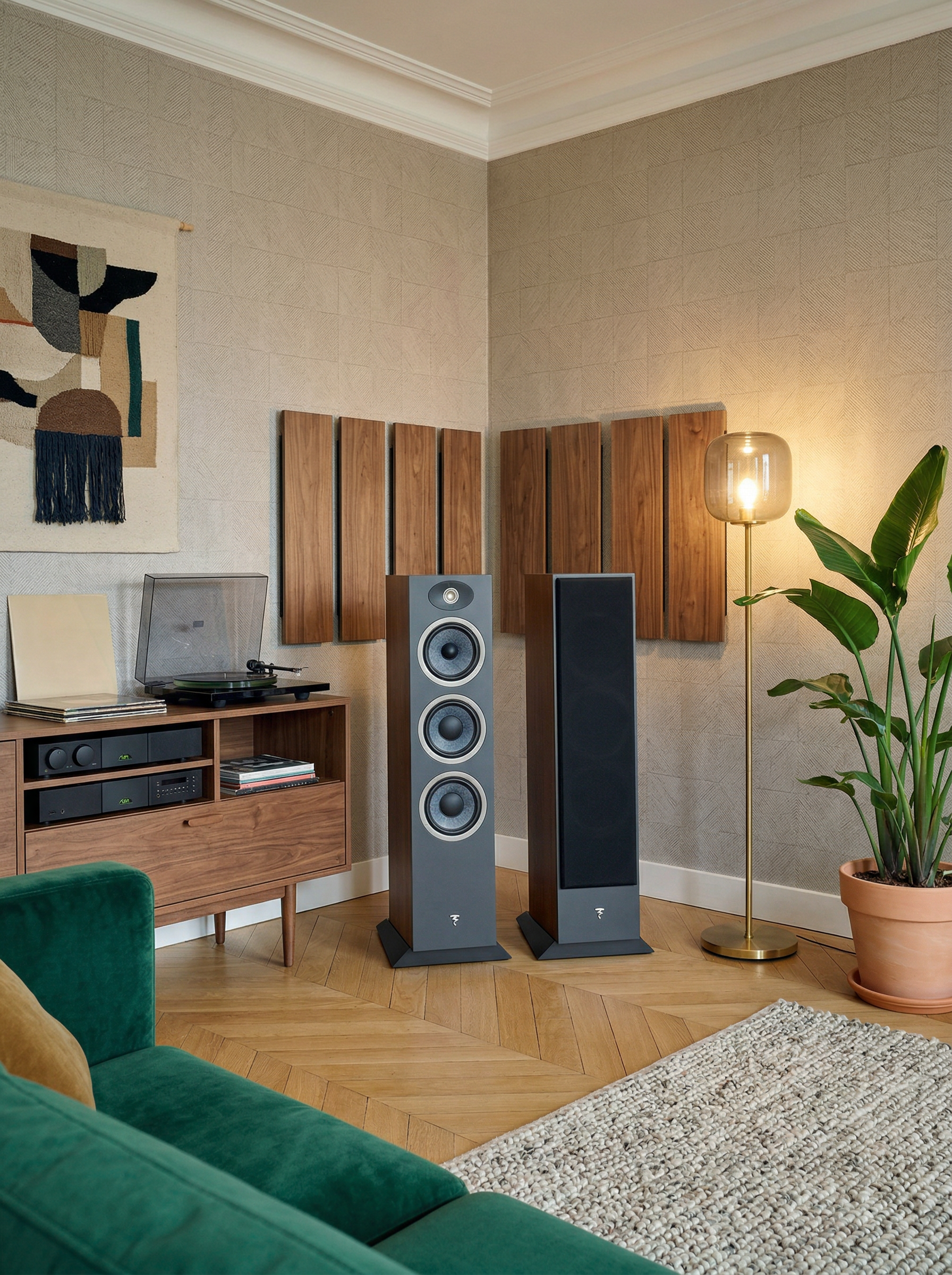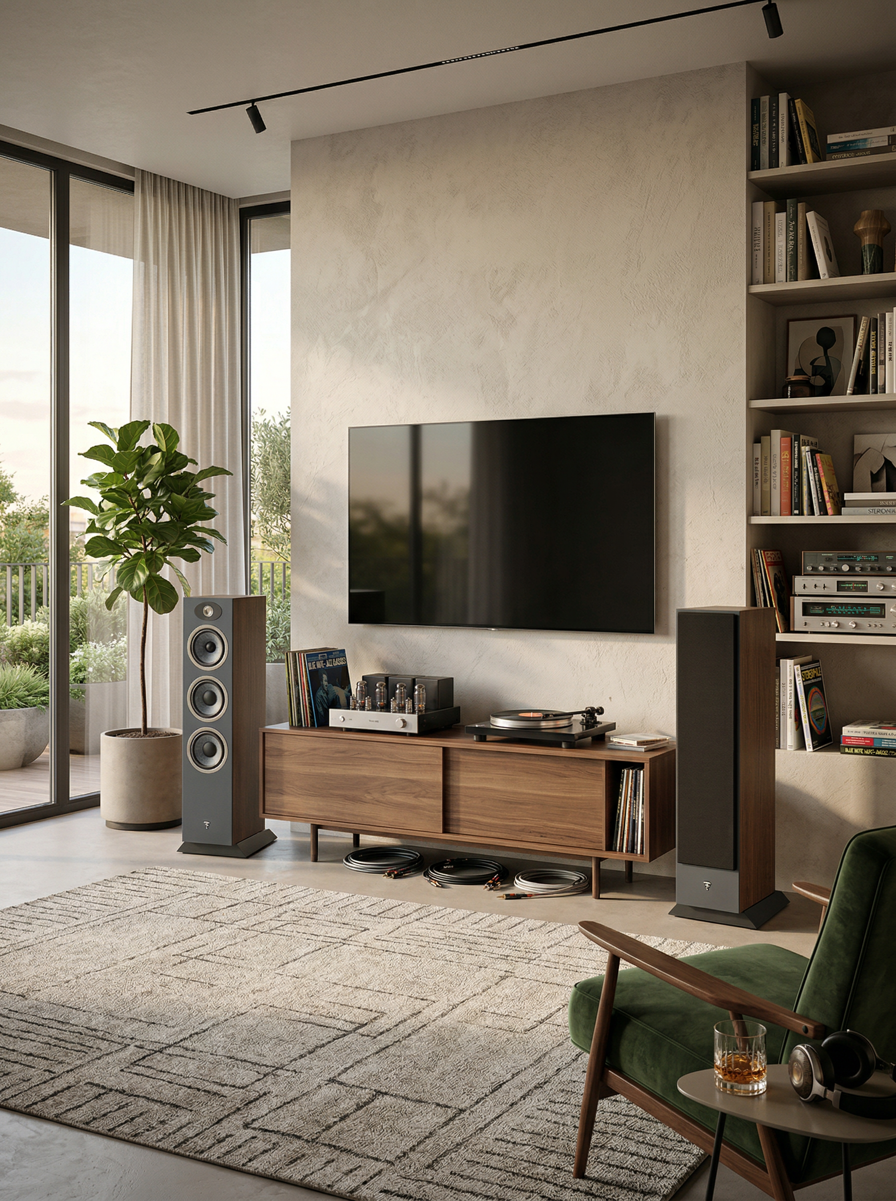 Los Focal Theva N3 pueden instalarse como altavoces frontales izquierdo y derecho en una sala mediana o grande (idealmente desde 18–20 m²), ubicándolos separados entre sí entre 2 y 3 metros y formando un triángulo equilátero con el punto de escucha, ligeramente orientados hacia el oyente para mejorar la imagen estéreo; es recomendable dejarlos a unos 30–50 cm de la pared trasera para que los puertos bass-reflex trabajen correctamente sin reforzar excesivamente los graves. Deben conectarse a un amplificador estéreo integrado o a un receptor AV de potencia adecuada mediante cable de parlante de cobre libre de oxígeno (OFC) calibre 12 o 14 AWG, asegurando conexiones firmes con bananas o cable pelado bien ajustado, y como fuentes pueden integrarse un televisor (vía HDMI eARC al receiver), un streamer de música, tocadiscos con preamplificador phono o reproductor de CD; además, pueden complementarse con un canal central, altavoces surround y un subwoofer activo si se busca un sistema 5.1 para cine en casa. Para optimizar el rendimiento acústico, el espacio debe contar con alfombras, cortinas o mobiliario que ayuden a controlar reflexiones y evitar superficies excesivamente reflectantes o esquinas muy cerradas, logrando así un sonido equilibrado, potente y bien definido en un entorno doméstico real.